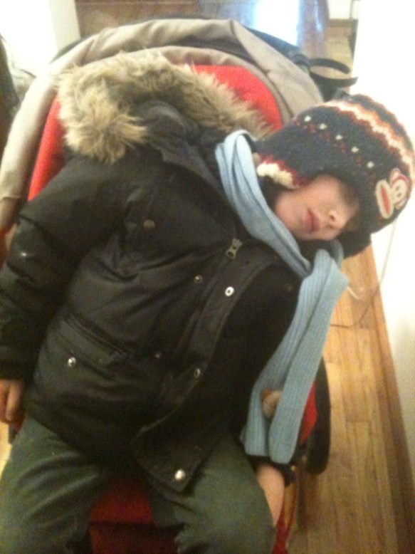 My 3-year-old son is tall, very tall. He is often mistaken for a 5-year-old and the normal antics of a 3-year-old can seem like the behavior of a troubled first grader. But this doesn’t bother me as much as the looks he gets when he falls asleep in the stroller. He still takes a midday nap, and when we’re out, he falls asleep in the stroller, perfectly normal for a 3-year-old. Except when I’m coming home with my napping boy splayed out in a stroller that is just too small, it looks like a have a drugged child in a wheelbarrow, or worse, another spoiled “Park Slope brat” who refuses to walk and needs to be chauffeured everywhere. Hey gets stared at as we walk by. People actually stop us and tell me “he’s too old to be in a stroller.” My wife usually snaps, “he’s only 3.” I usually ignore them or say “Then I’m glad your opinion means nothing to me.” But the worst was when a deranged homeless guy followed us yelling “get up and fuckin’ walk!”