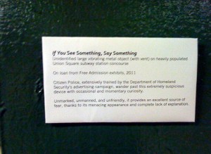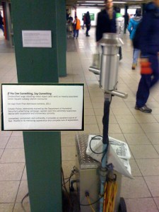Apparently someone thought  the industrial looking unmarked air sensor in the Union Square subway station looked like an art installation on loan from a museum.  All that was missing was the museum plaque with a title and esoteric description: