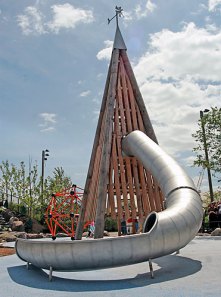 The”The Water Lab” was next, which is a boulder strewn winding stream with sprinklers, sluice, and an Archimedes’ screw. It really is a small water park with a Myst-like quality. Really beautiful with lots of things for kids to play with, and lots of spots for parent to sit just far enough away not to get wet.